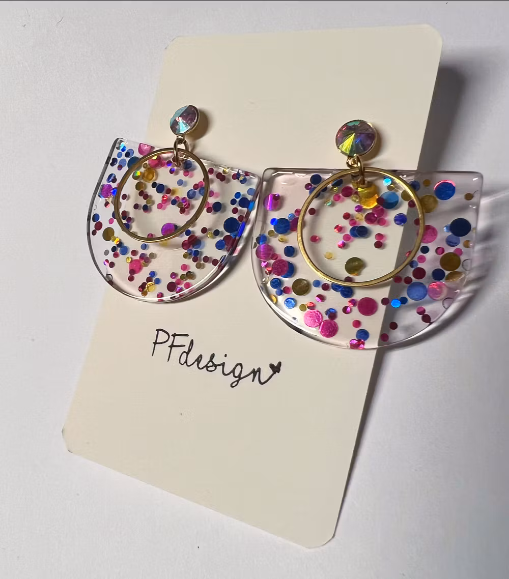 Örhängen med Cubic ziconia studs i rostfritt stål, cerise/grön plexi bricka med guld detaljer.